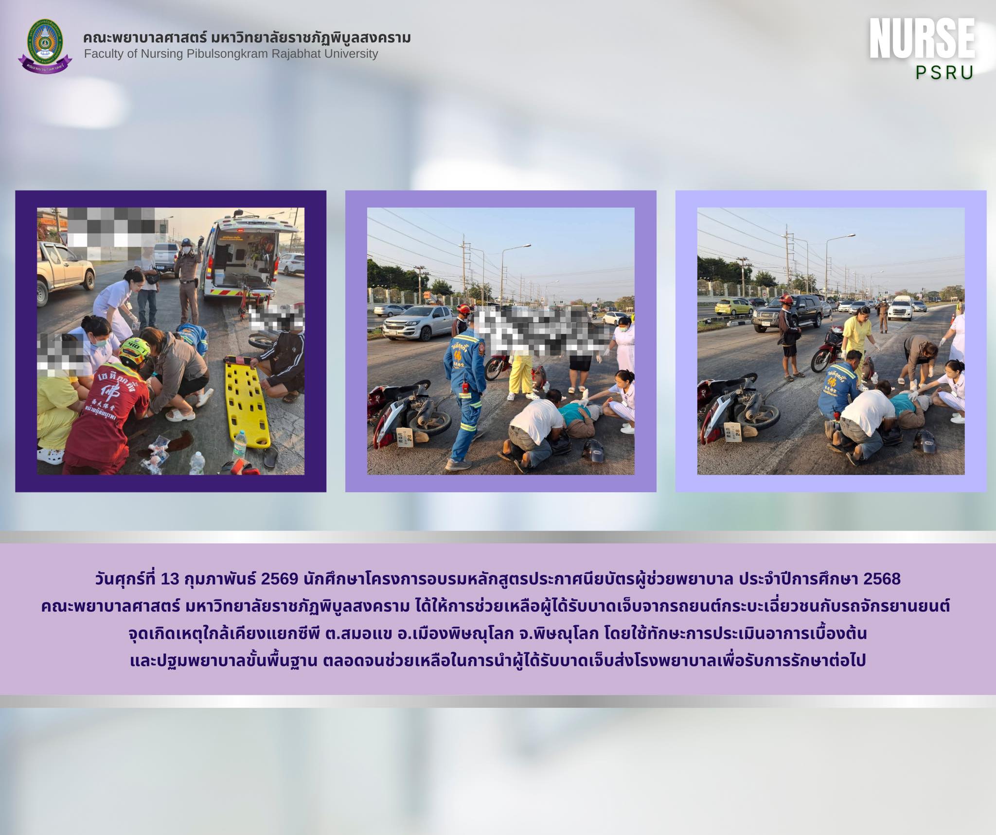 วันศุกร์ที่ 13 กุมภาพันธ์ 2569 นักศึกษาโครงการอบรมหลักสูตรประกาศนียบัตรผู้ช่วยพยาบาล คณะพยาบาลศาสตร์ มหาวิทยาลัยราชภัฏพิบูลสงคราม ได้ให้การช่วยเหลือผู้ได้รับบาดเจ็บจากรถยนต์กระบะเฉี่ยวชนกับรถจักรยานยนต์ จุดเกิดเหตุใกล้เคียงแยกซีพี ต.สมอแข อ.เมืองพิษณุโลก จ.พิษณุโลก โดยใช้ทักษะการประเมินอาการเบื้องต้น และปฐมพยาบาลขั้นพื้นฐาน ตลอดจนช่วยเหลือในการนำผู้ได้รับบาดเจ็บส่งโรงพยาบาลเพื่อรับการรักษาต่อไป