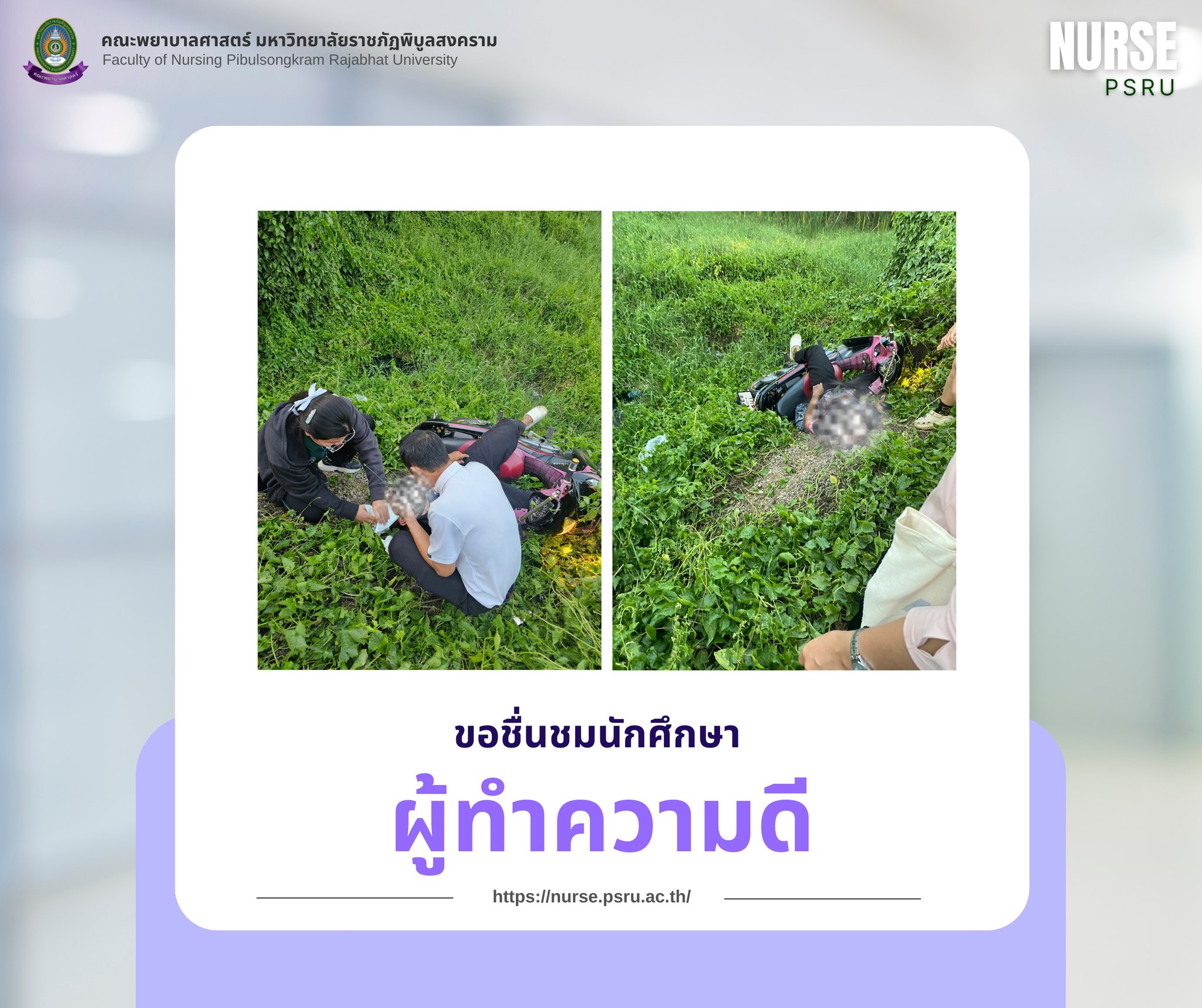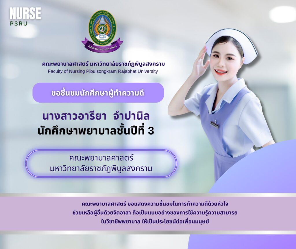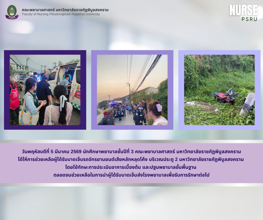 วันพฤหัสบดีที่ 5 มีนาคม 2569 นักศึกษาพยาบาลชั้นปีที่ 3 คณะพยาบาลศาสตร์ มหาวิทยาลัยราชภัฏพิบูลสงคราม ได้ให้การช่วยเหลือผู้ได้รับบาดเจ็บรถจักรยานยนต์เสียหลักหลุดโค้ง บริเวณประตู 2 มหาวิทยาลัยราชภัฏพิบูลสงคราม โดยใช้ทักษะการประเมินอาการเบื้องต้น และปฐมพยาบาลขั้นพื้นฐาน ตลอดจนช่วยเหลือในการนำผู้ได้รับบาดเจ็บส่งโรงพยาบาลเพื่อรับการรักษาต่อไป