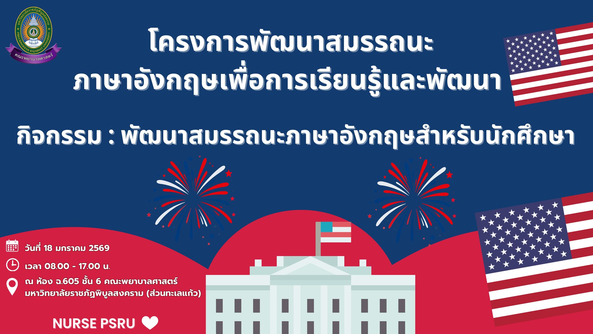 เมื่อวันอาทิตย์ที่ 18 มกราคม 2569 คณะพยาบาลศาสตร์ ได้ดำเนินการจัดโครงการพัฒนาสมรรถนะภาษาอังกฤษเพื่อการเรียนรู้และพัฒนา (คพบ.) ภายใต้กิจกรรม “พัฒนาทักษะภาษาอังกฤษสำหรับนักศึกษา” โดยได้รับเกียรติจากอาจารย์ประจำหลักสูตรสาขาวิชาภาษาอังกฤษ คณะมนุษยศาสตร์และสังคมศาสตร์ มหาวิทยาลัยราชภัฏพิบูลสงคราม ได้แก่ ผู้ช่วยศาสตราจารย์ ดร.โชติกา เศรษฐธัญการ และ อาจารย์ ดร.วารีรัตน์ สีแดง เป็นวิทยากรในการอบรม ณ ห้อง ฉ.605 ชั้น 6 คณะพยาบาลศาสตร์ มหาวิทยาลัยราชภัฏพิบูลสงคราม (ส่วนทะเลแก้ว)